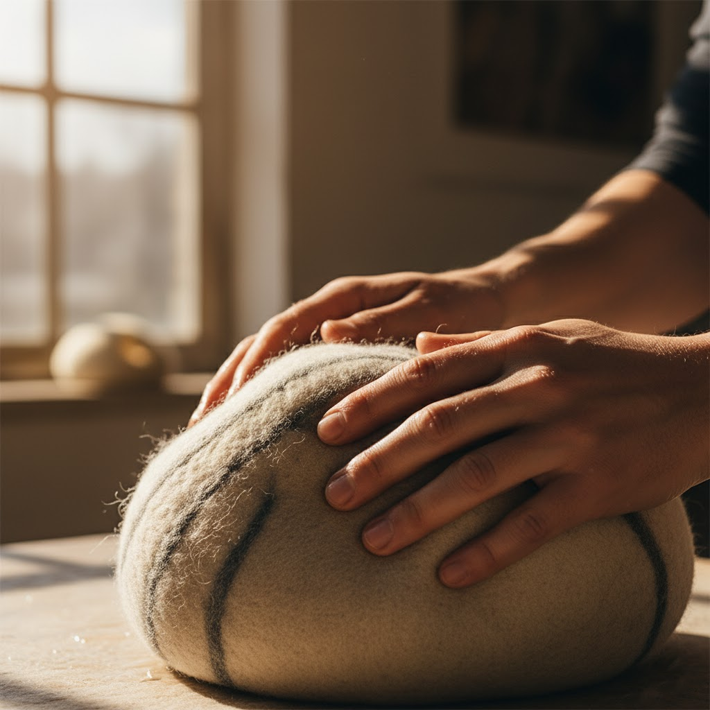 Svaka špilja ručno se filca satima — voda, toplina i ritam stvaraju strukturu koja diše.
