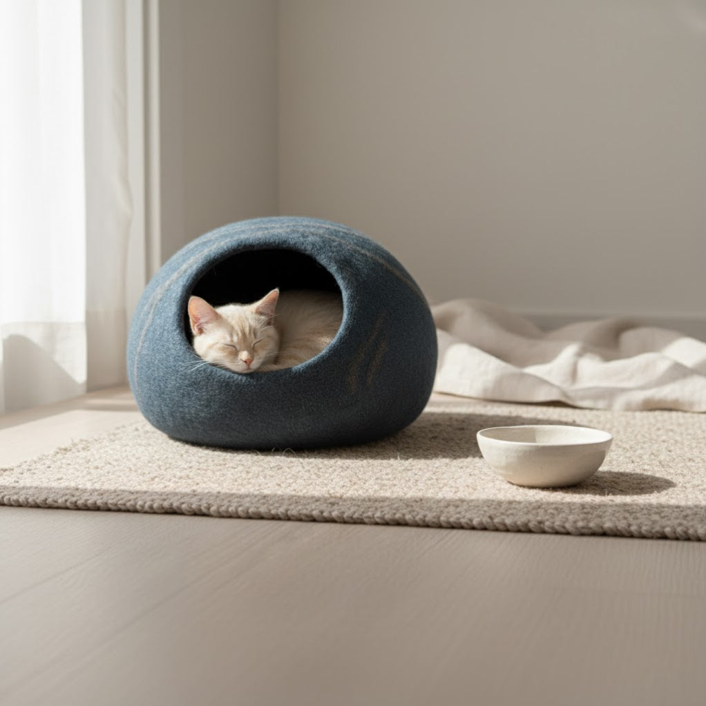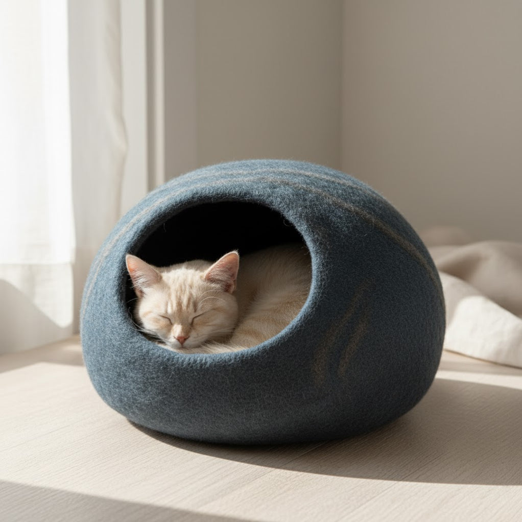 Unutra se stvara prostor koji diše — topao, miran i siguran. Vuna prirodno održava temperaturu, a svojom elastičnošću prilagođava se tijelu mačke. Abyss poziva na smirenje, na povratak sebi. U njoj svaka mačka postaje dio tišine — zaklonjena od svijeta, obavijena toplinom i tamom koja grije.