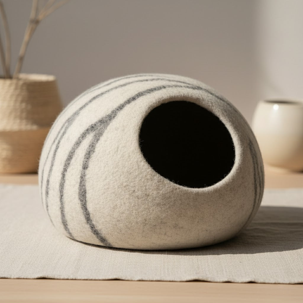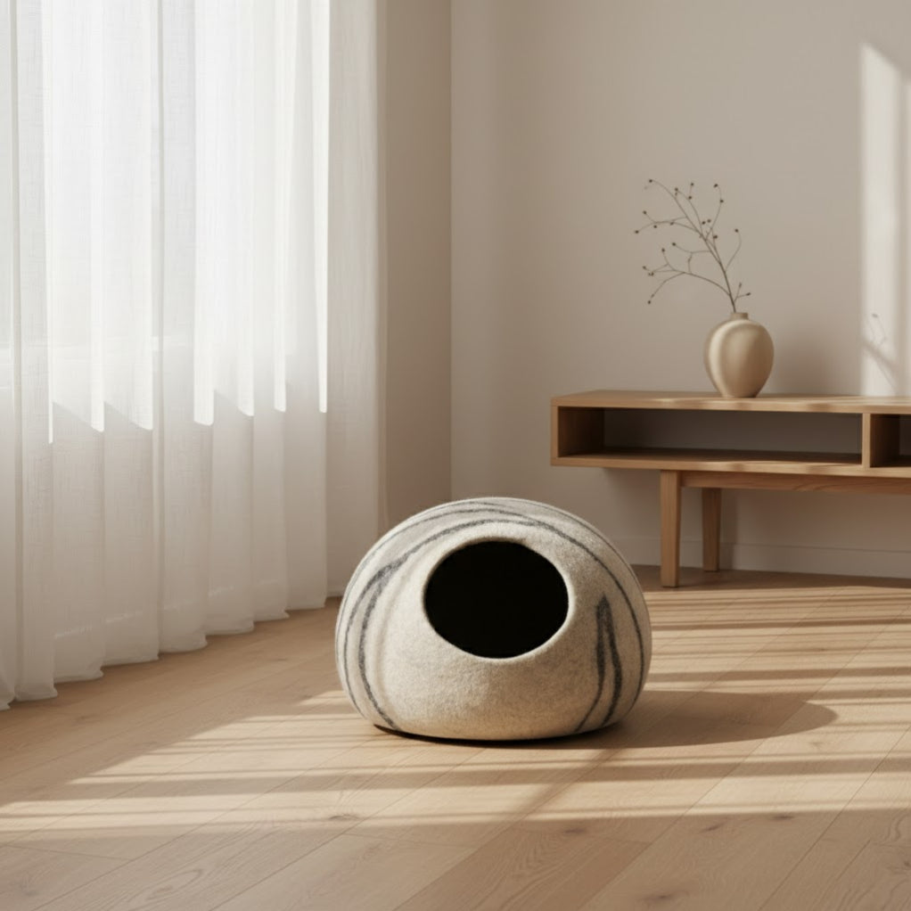 Bez šavova i umjetnih vlakana, njezina površina diše i regulira temperaturu, stvarajući ugodno, prirodno utočište za mačku. Unutra, toplina se zadržava, a mekoća materijala umiruje tijelo i osjetila. Ivoria nije samo ležaj — to je mali arhitektonski trenutak tišine, u kojem priroda i dom dišu istim ritmom.