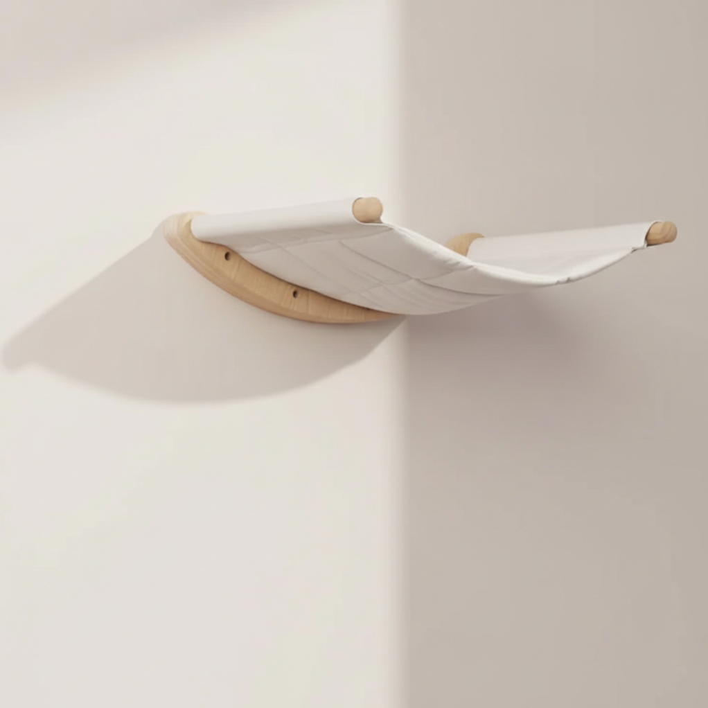 Petino zidna viseća ležaljka za mačke unosi tišinu, toplinu i lagani pokret u savršenu ravnotežu. Ručno izrađena od svijetlog drva i pamučnog platna, oblikovana je kao siguran i smiren prostor za penjanje, odmor i promatranje svijeta s visine.